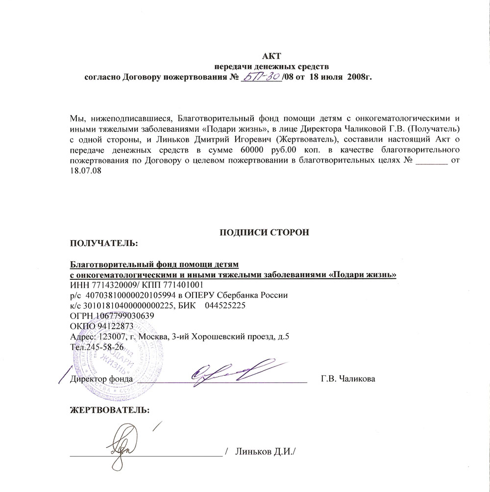 Акт о пожертвовании, заполненный на мое имя (необходимость для бухгалтерии)